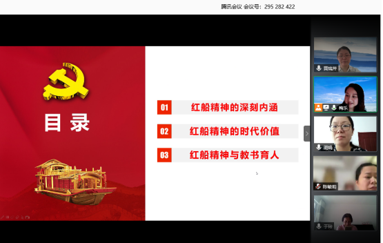 “紅船精神”蘊含著豐富的育人價值,讓學生成長為勇于創新、奮斗、奉獻的新時代優秀青年,既是時代之需,也有重要的現實意義。最后,梅樂老師與大家分享了如何將“紅船精神”與教書育人結合起來的心得體會,一是要永葆艱苦奮斗的精神狀態,堅定共產黨人的理想信念,培養實事求是的精神品格,崇尚求真務實的價值取向;二是要牢記立德樹人的根本使命,以“學高身正”的人格以及淵博的學識魅力潛移默化地感召學生,給予學生“真心喜歡、終身受益”的教育引導,真正成為學生成長成才的引路人;三是要培養敢為人先的創新意識,要敢于突破,積極探索,也要堅忍不拔、持之以恒,不忘初心,把“紅船精神”厚植于教書育人、人才培養全過程。