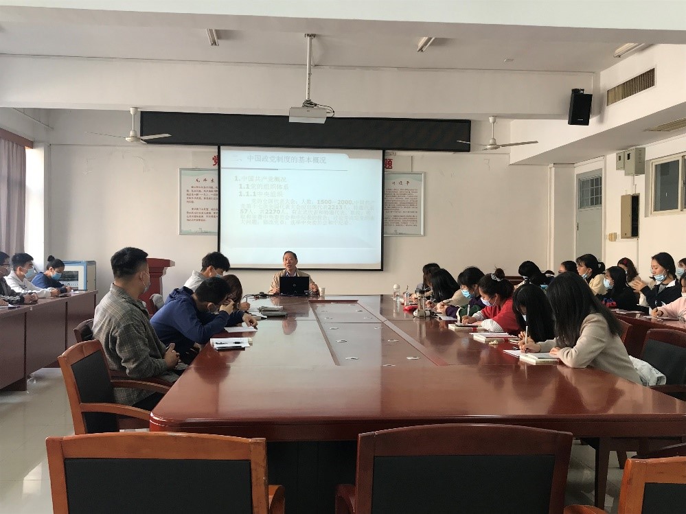 11月16日,我院第9期發展對象培訓班第四次課程在15號教學樓815會議室展開。課程由17級輔導員張海燕老師主持,我院吳開松院長為各位發展對象進行了以“中國政黨制度”為主題的培訓,全體發展對象參與了此次課程培訓。