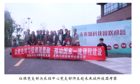 2021年4月22日下午,勞動與社會保障黨支部和采購與招標中心黨支部師生聯合開展“以黨史學習促課程思政,推動國家一流課程建設”主題黨日活動,共赴未來城科技園進行考察學習。未來城科技園充分依托優勢學科資源和光谷核心創新資源,是我校加快推進產教結合,推動“雙一流”建設,服務湖北經濟社會發展的重要基地,現已初具規模。