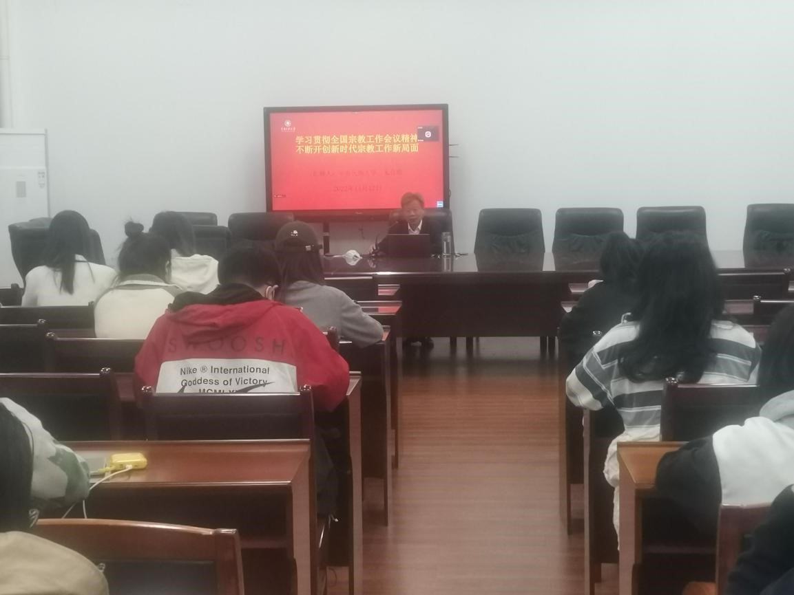 課堂中,朱教授還為同學們指出,十八大以來黨中央高度重視宗教工作。貫徹黨的宗教工作基本方針更加全面、宗教工作體制機制進一步完善、宗教工作法律體系和政策框架日益健全、宗教界人士和信教群眾尊法、學法、守法、用法的意識不斷增強、我國宗教中國化逐步深入。朱老師希望同學們認真學習二十大報告,從中有所收獲。習近平總書記提出了一系列關于中國宗教工作的新理念,老師引用習近平總書記的講話進一步加深同學們對宗教工作的理解。
