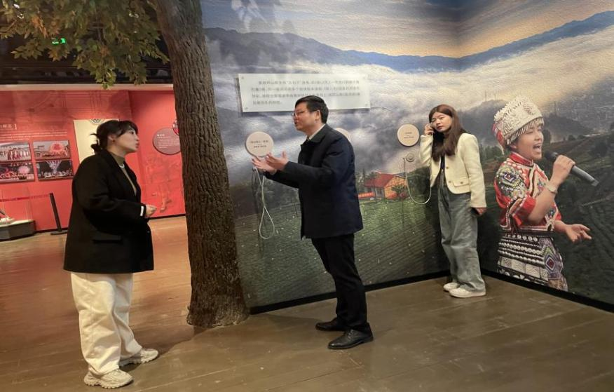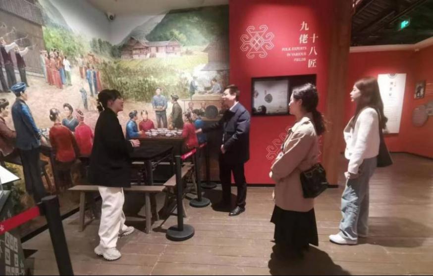 12月7日上午,師生一行來到中華民族共同體五峰體驗館,先后參觀了“楚香非遺研學(xué)課程館”“宜紅茶工業(yè)遺產(chǎn)”“土家民俗館”和“五峰非遺傳承館”,在實物展示、視頻影像、全息投影等科技手段所呈現(xiàn)的豐富史料中,從歷史的維度直觀感受各民族交融、共創(chuàng)五峰的生動故事。