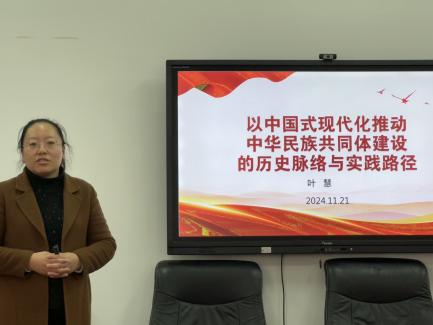 會議伊始,葉慧教授結合《中華民族共同體概論》教材講述了以中國式現代化推動中華民族共同體建設的重要意義。在講座進行過程中,葉慧教授將講授的內容和黨的二十屆三中全會精神、習近平總書記在全國民族團結進步表彰大會上的重要講話緊密結合,以時間為脈絡,梳理了新中國成立以來我國現代化建設的具體實踐路徑。當中國特色社會主義進入新時代,中華民族迎來了從站起來、富起來到強起來的偉大飛躍,中華民族共同體建設進入新的歷史發展階段。全面建設社會主義現代化國家的新征程上一個民族都不能少,共同團結奮斗、共同繁榮發展。新征程上,要賦予所有改革發展以彰顯中華民族共同體意識的意義,以維護統一、反對分裂的意義,以改善民生、凝聚人心的意義,讓中華民族共同體牢不可破。葉慧教授的講座將三中全會精神與理論實踐相結合,讓與會人員更好地理解中國式現代化與鑄牢中華民族共同體意識的內在聯系,對黨的二十屆三中全會精神和鑄牢中華民族共同體意識形成了更加系統化的認知。