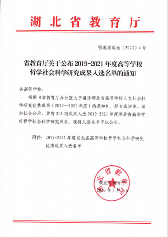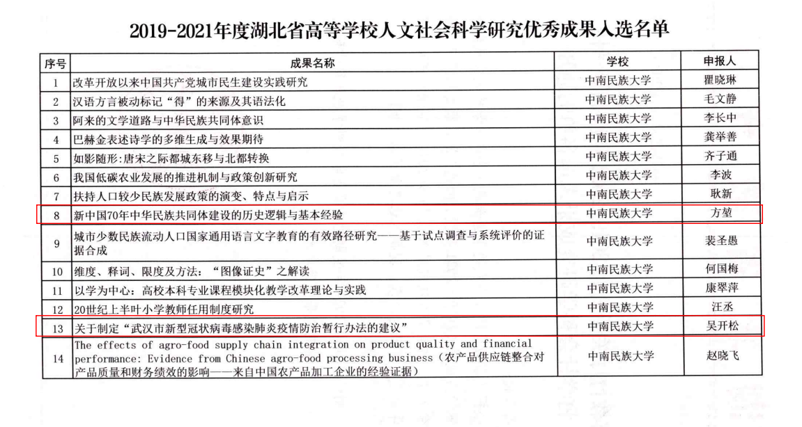 近日,省教育廳公布了2019-2021年度湖北省高等學校人文社會科學研究優秀成果的通知。經專家評審,面向社會公示,學校共14項成果入選,其中我院吳開松教授的研究報告《關于制定“武漢市新型冠狀病毒感染肺炎疫情防治暫行辦法的建議”》、方堃副教授的論文《新中國70年中華民族共同體建設的歷史邏輯與基本經驗》獲獎。