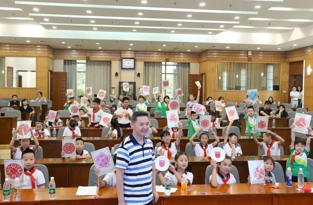 在非遺剪紙課堂,湖北省工藝美術大師沈松柏老師執剪示范,帶領學生們在紅紙上精心鏤刻出“哪吒”“春”等充滿中華韻味的圖案。剪刀翻飛間,孩子們屏息凝神,指尖流淌的不僅是對傳統技藝的探索熱情,更是對文化根脈的深切體認。一張張剪紙作品,成為無聲的愛國宣言,將維護文化安全、傳承民族精粹的種子悄然埋入心田。