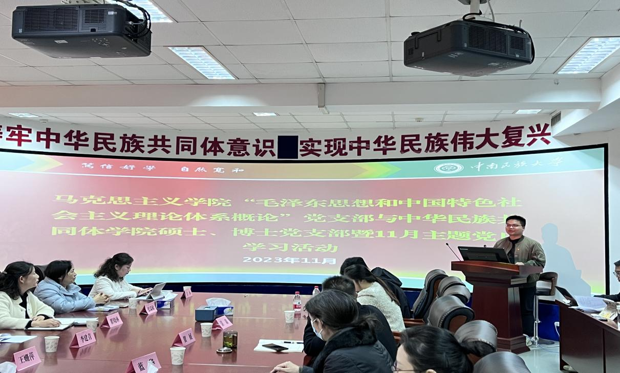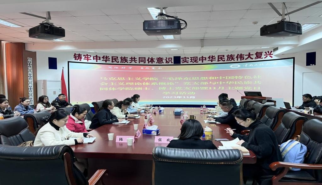 為引導黨員師生進一步學深悟透習近平總書記在二十屆中央政治局第九次集體學習時的重要講話精神,充分發(fā)揮黨建引領作用,加強黨支部間的學習交流,實現(xiàn)黨支部建設“優(yōu)勢互補、互相促進、共同提高”,2023年11月24日,我院碩士、博士研究生黨支部與馬克思主義學院“毛澤東思想和中國特色社會主義理論體系概論”師生聯(lián)合黨支部聯(lián)合開展“弘揚中華民族精神,鑄牢中華民族共同體意識”主題黨日活動,雙方師生黨員干部共55人參加此次活動。會議由馬克思主義學院副院長、支部書記瞿曉琳主持。