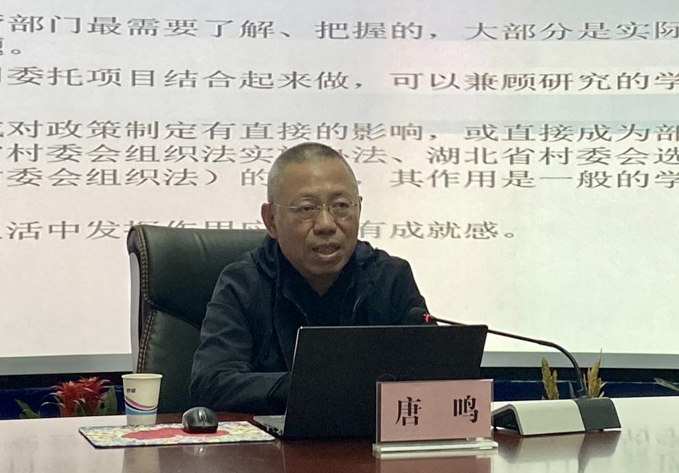 11月21日,華中師范大學政治與國際關系學院院長唐鳴教授應邀走進我院“中華民族共同體大講壇”,作了題為《我做民政部的“命題作文”》專題報告,與我校師生分享了近年來從事民政部委托項目研究時總結出的一些工作原則和工作經驗。報告會由副院長李學保主持,我院及民族學與社會學學院、文學與新聞傳播學院部分師生現場聆聽了報告。