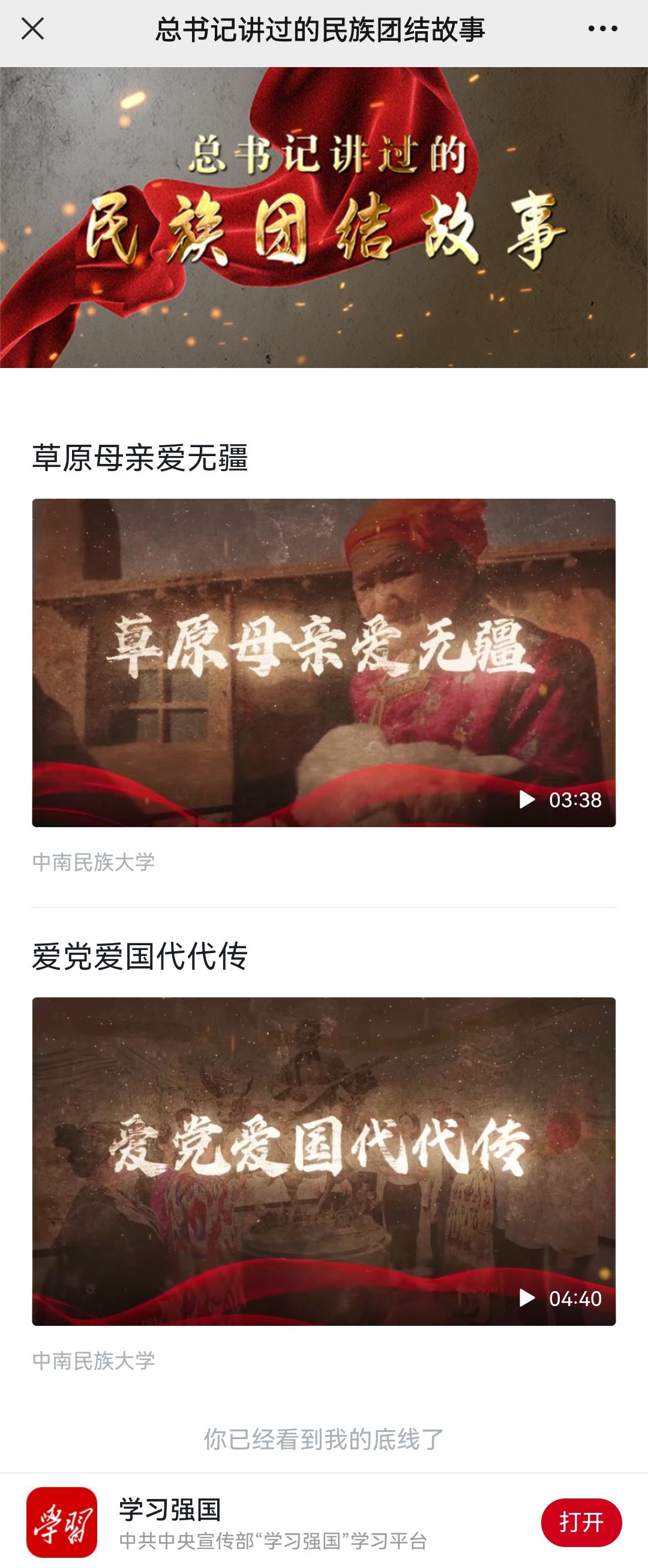 為深入學習宣傳貫徹習近平總書記關于加強和改進民族工作的重要思想、黨的二十大精神以及全國民委主任會議精神,以鑄牢中華民族共同體意識為主線,講好民族團結故事,凝聚時代奮進力量,助力推進中華民族共有精神家園建設,近日,我院推出了《總書記講過的民族團結故事》系列主題宣傳視頻,并被學習強國平臺專題推介。