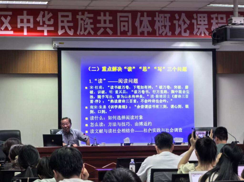 2024年9月27日晚,中南民族大學國務院政府特殊津貼者,國家民委首屆突出貢獻專家、湖北省學科帶頭人、博士研究生導師雷振揚教授在“澤霖講堂”為我院2023和2024級碩士、博士研究生做了一場題為“中華民族共同體學院研究生專業研習應注意的幾個問題”的學術講座。副院長李學保教授主持學術講座。
