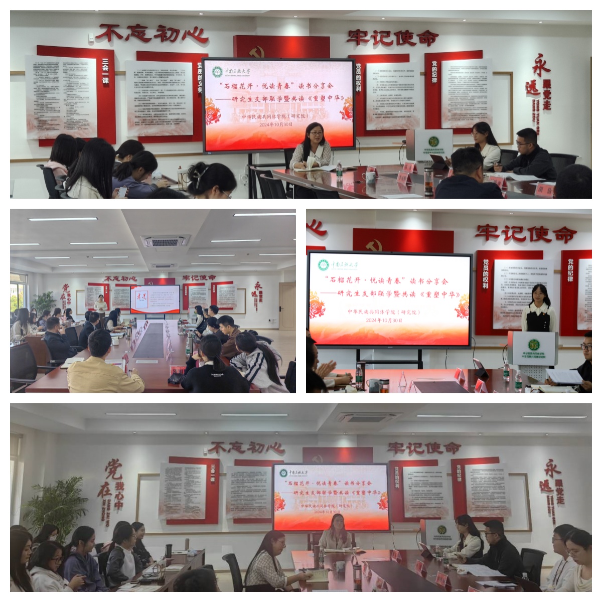 為深入學習貫徹習近平總書記關于加強和改進民族工作的重要思想以及全國民族團結進步表彰大會等精神,10月30日,我院開展博士、碩士生支部聯學暨“石榴花開·悅讀青春”讀書分享會活動,引領師生共讀中國人民大學清史研究所黃興濤教授所著的《重塑中華》。學院黨總支書記賀展,院長李從浩教授、副院長李學保教授、李安輝教授、王艷勤教授、學工辦副主任湛諶以及碩士、博士研究生共三十余人參加了此次活動。會議由碩士生黨支部宣傳委員郭琳主持。