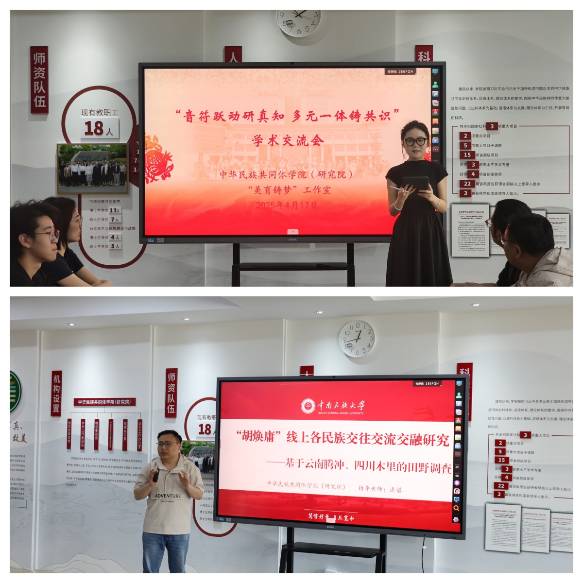 會上,“美育鑄夢”工作室學(xué)生代表楊瑞文分享了“石榴籽文藝輕騎兵”在社會實踐中鑄牢中華民族共同體意識的體會與感悟。我院2023級博士研究生熊永恒同學(xué)則圍繞“胡煥庸線上各民族交往交流交融現(xiàn)狀研究”的調(diào)查研究成果進(jìn)行經(jīng)驗分享。