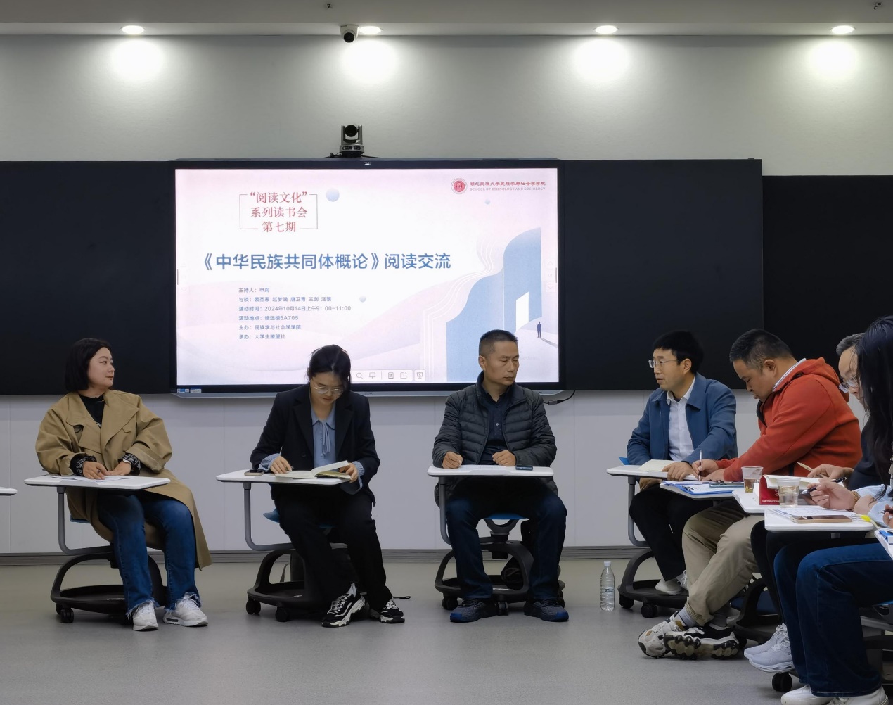 湖北民族大學民族學與社會學學院(中華民族共同體學院)院長楊洪林、副書記申莉、副院長唐衛青、教研室主任王劍,以及教師代表和碩士生參加主題教研暨“閱讀文化”系列讀書會。裴圣愚、趙夢涵介紹了概論課教學和建設有關情況,并分享了《概論》教材的閱讀學習體會。