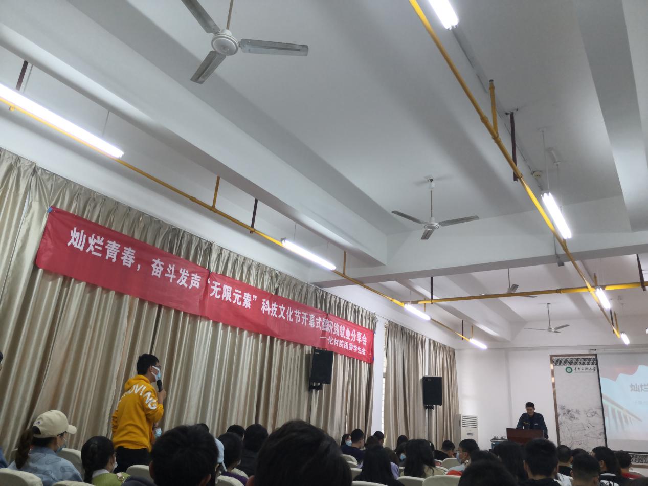最后,郭書記簡單介紹了今年的“無限元素”科技文化節(jié)的活動內(nèi)容,共設(shè)有4個項目,“無限元素”科技文化節(jié)開幕式暨研路就業(yè)分享會、民族健身操大賽、化學實驗周以及化學方程式大賽,并且鼓勵大家積極參加活動。