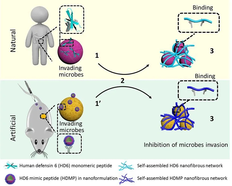 近年來,抗生素的使用導(dǎo)致菌群失調(diào)和耐藥菌的出現(xiàn)。抗生素不具備選擇性,在殺死病原菌的同時(shí),也將腸道內(nèi)的有益菌一同殺死了,導(dǎo)致所謂的菌群失調(diào)現(xiàn)象:從過去的有益菌占優(yōu)勢的狀態(tài),變?yōu)橛泻純?yōu)勢的狀態(tài),從而引發(fā)各種疾病。另一方面,重復(fù)使用一種抗生素會(huì)使致病菌產(chǎn)生抗藥性,即我們在使用抗生素治療疾病的同時(shí),也使細(xì)菌的耐藥能力增強(qiáng),最終對這種抗生素不再敏感。如今的“超級細(xì)菌”就是濫用抗生素的結(jié)果。我國細(xì)菌對抗菌藥物的耐藥形勢仍較嚴(yán)重,尤其是碳青霉烯類耐藥革蘭陰性桿菌、革蘭氏陽性耐甲氧西林金黃色葡萄球菌(MRSA)。現(xiàn)在亟需新型精準(zhǔn)抗菌策略來解決這一尷尬局面。科學(xué)家試圖從人類免疫系統(tǒng)中尋找到新的抗菌機(jī)制并從中找到靈感。防御素是在生物免疫系統(tǒng)中起到重要調(diào)節(jié)作用的多肽分子,并且大多數(shù)防御素具有直接殺菌功能,是重要的抗菌肽。人防御素-6(HD-6)在小腸分泌性潘氏細(xì)胞高表達(dá)并且通過自組裝形成纖維網(wǎng)絡(luò),鉚釘細(xì)菌阻止其入侵宿主細(xì)胞來進(jìn)行抗菌。HD-6這種捕獲抗菌機(jī)制的發(fā)現(xiàn)提供了一種仿生模型,可以作為一種新的抗菌策略。本研究利用多肽納米技術(shù)在體內(nèi)實(shí)現(xiàn)了HD-6抗菌過程的仿生。設(shè)計(jì)并合成了一條HD-6模擬肽(HD6 mimic peptide, HDMP),納米顆粒形態(tài)的HDMP可以靶向體內(nèi)金黃色葡萄球菌表面,形變組裝成納米纖維捕獲細(xì)菌,阻止細(xì)菌入侵宿主細(xì)胞,防治感染,取得較好的抗菌效果。