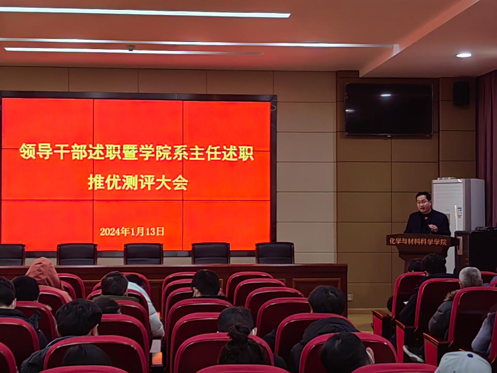 1月13日上午,化材學院舉行學院領導班子和內設機構負責人年終述職測評會。會議全面總結2023年度學院工作,盤點成績,總結經驗,查找不足,規劃未來。學院黨政班子成員和全體教職工參加會議,會議由院黨委書記祁帆主持。