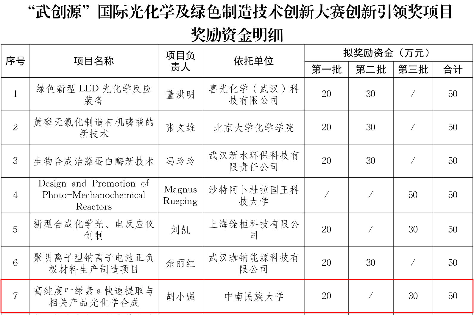 本次大賽由武漢市科技創新局、青山區人民政府、華中師范大學聯合舉辦,旨在發掘光化學與綠色制造領域前沿性、創新性技術成果,以技術創新推動我市產業升級與綠色轉型。大賽“以用為導向”為原則,采用“政產學研”合作方式組織,并創新性地采用“專家評技術、市場評價值、落地評環境”新模式,加速科技成果的轉化與應用,推動武漢乃至全球光化學與綠色制造產業的發展。大賽執行團隊在世界多個國家和地區光化學及綠色制造技術領域招募符合大賽要求的項目共計331項。經線上參賽資格篩選,共計80個團隊晉級預賽;經線下路演、答辯等環節的激烈角逐及走訪考察和線下項目落地論證,共計12個研發團隊獲得“創新引領獎”。
