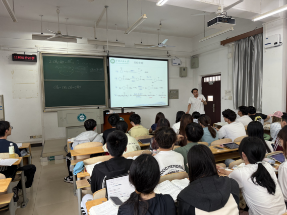 教學觀摩展風采,互學互鑒促成長。活動第一階段為學院多名教師參加了教學先進個人胡曉允老師的《有機化學》課堂觀摩活動。胡曉允老師授課條理清晰,邏輯嚴謹,層層遞進,引導學生深入思考,課堂氣氛活躍。通過“理論講授+案例分析+課堂互動”的多元化教學模式,生動詮釋了如何將學科前沿與基礎理論有機融合。