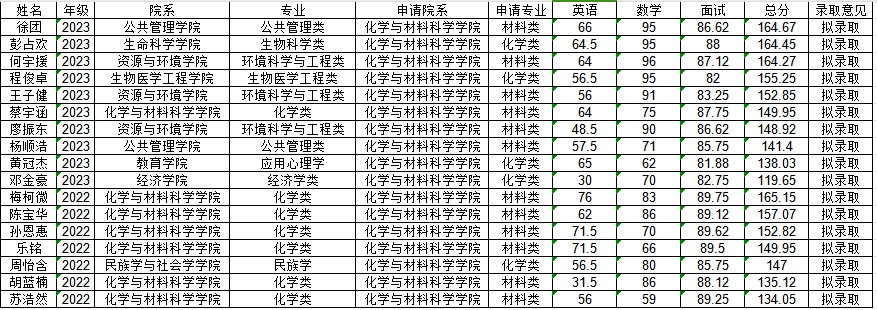 說明:以上結果還需經過學校審核,最終錄取以學校審核結果為準。公示期為2023年11月21日--2023年11月23日。公示期內如有異議,請聯系孫老師,電話:027-67840955,郵箱:55896751@qq.com.地址:化學與材料科學學院7號樓112辦公室。