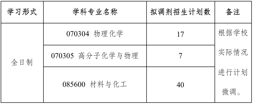 070304物理化學和070305高分子化學與物理專業,根據調劑合格生源情況,兩者之間進行指標微調。