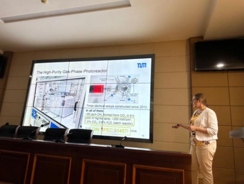 報告第二部分詳細地介紹光催化還原二氧化碳。Jennifer Strunk教授利用高純度氣相光反應器和紅外光譜技術,揭示了TiO2 P25在反應過程中的許多機理細節。主要產物CH4只能通過涉及C2中間體(如乙酸或乙醛)的途徑形成,而C1機制只能導致CO形成。光強烈影響二氧化碳的吸附,這可能是第一個基本步驟。盡管含碳產物的形成明顯來自二氧化碳,但氧氣不會逸出,而是儲存在TiO2體中。用放氧共催化劑改性TiO2,可以得到能夠在氣固系統中整體分解水的光催化劑,但不會形成含碳產物。令人驚訝的是,從二氧化碳到甲烷的反應途徑不是后續的還原事件鏈,還涉及光生空穴,因此這兩個半反應在TiO2上是不可分割的。解吸限制可能是產物量有限的另一個原因。總之,需要新的材料組合(如Z方案)來正確分離半反應。此外,她建議進行光熱聯合催化反應,而不是室溫下的純光催化反應。對于后者,使用工業型Cu/ZnO/Al2O3催化劑取得了有希望的結果。報告結束后,Jennifer Strunk教授同在座師生就光催化反應中存在的問題和挑戰進行了討論和交談。