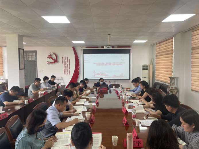 會(huì)議首先進(jìn)行原文領(lǐng)學(xué)環(huán)節(jié)。由馬克思主義學(xué)院副院長(zhǎng)黎海波教授、張濤華教授、董杰副教授,國(guó)際合作與交流處副處長(zhǎng)胡晶晶領(lǐng)學(xué)《習(xí)近平新時(shí)代中國(guó)特色社會(huì)主義思想學(xué)習(xí)綱要》第十七章“推動(dòng)構(gòu)建人類(lèi)命運(yùn)共同體”全文內(nèi)容。
