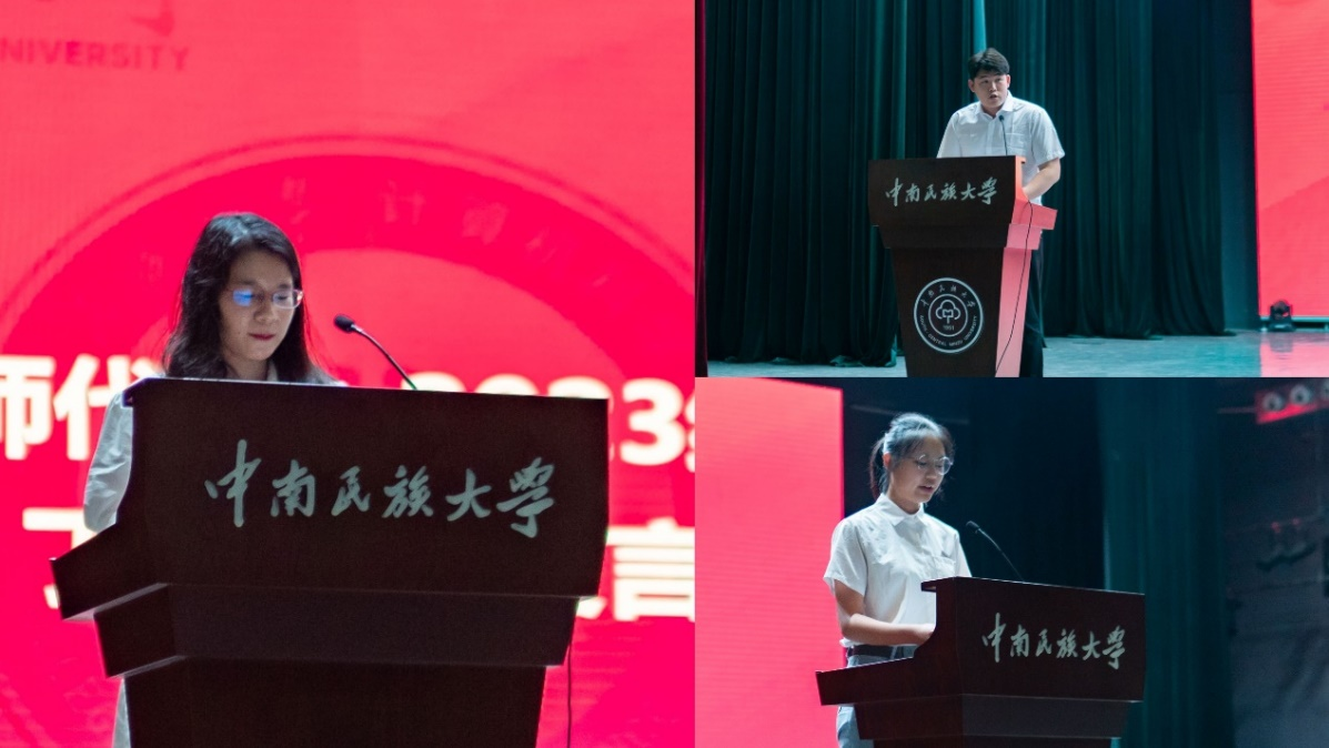 教師代表丁鳳老師、2020級(jí)學(xué)生代表鄭卓然同學(xué)、2023級(jí)新生代表劉好同學(xué)作發(fā)言