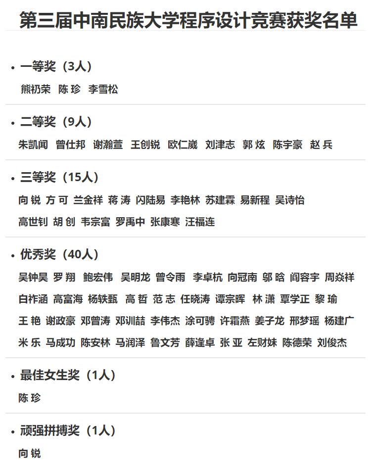 至此,中南民族大學第三屆程序設計競賽圓滿結束。本次競賽給為廣大同學提供了一次展示才能的舞臺,也是一次為學校與和全國ICPC大賽發現人才,鼓舞人才,培養人才的契機。