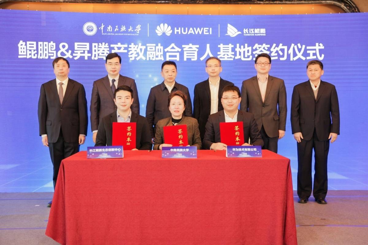 12月27日下午,中南民族大學(xué)、華為技術(shù)有限公司、長(zhǎng)江鯤鵬生態(tài)創(chuàng)新中心在武漢萬達(dá)瑞華酒店舉行鯤鵬&昇騰產(chǎn)教融合育人基地簽約及揭牌儀式。湖北省教育廳副廳長(zhǎng)周啟紅、華為技術(shù)有限公司華為計(jì)算產(chǎn)品線副總裁姜濤、鯤鵬業(yè)務(wù)總裁張熙偉、華為計(jì)算業(yè)務(wù)副總裁張立鵬、華為湖北政企合作伙伴發(fā)展與管理部部長(zhǎng)楊彬、長(zhǎng)江鯤鵬生態(tài)創(chuàng)新中心有限公司COO柳俊逸,我校校長(zhǎng)李金林,校黨委常委、副校長(zhǎng)杜冬云,校黨委常委、紀(jì)委書記韓葉盛、黨政辦主任陳強(qiáng)勝、教務(wù)處處長(zhǎng)黃迎新、計(jì)科學(xué)院書記黎大有、院長(zhǎng)覃俊、副院長(zhǎng)帖軍及相關(guān)老師參加了活動(dòng)。