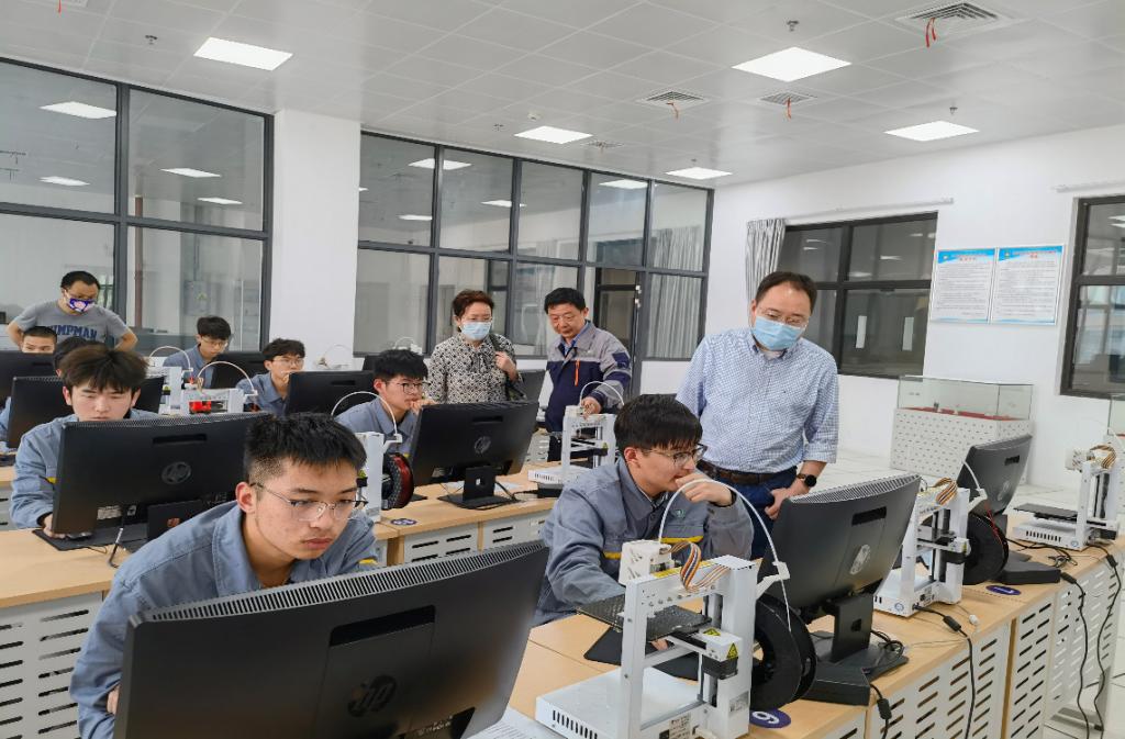 學校工程訓練中心賀軍主任、秦燕斌老師等熱情接待并帶領大家參觀了科技園區--工訓中心的數控車床、普車、鉗工、加工中心等各個工訓環節的車間,詳細介紹了各專業學生們正在不同工種場景開展工程訓練的具體情況。