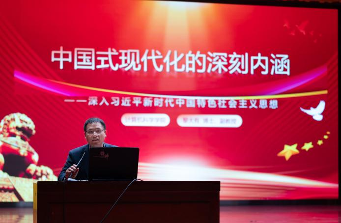 開班典禮之后,計算機科學(xué)學(xué)院黨委書記黎大有老師為學(xué)員進(jìn)行了黨課第一講。黎大有老師圍繞中國式現(xiàn)代化的深刻內(nèi)涵,帶領(lǐng)同學(xué)們深入學(xué)習(xí)習(xí)近平新時代中國特色社會主義思想,引導(dǎo)同學(xué)們深入了解我國國情,讓同學(xué)們意識到自己所肩負(fù)的責(zé)任,勉勵同學(xué)們做到“讀書不忘愛國,愛國不忘讀書”。