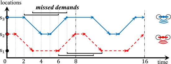 圖1:2個無人機協同合作服務3個離散節點位置(s1、s2、s3)
