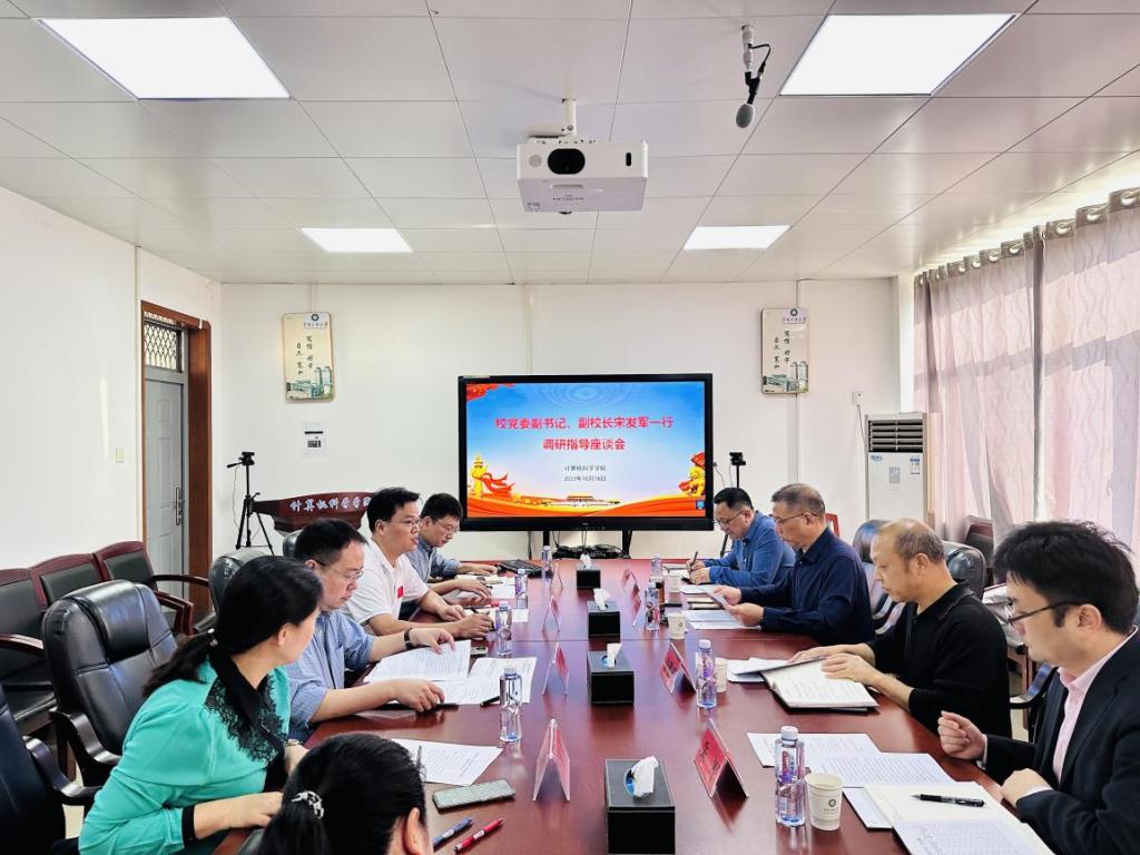 2023年10月18日上午,校黨委副書記、副校長宋發軍一行到計算機科學學院調研指導工作。招生就業工作處處長舒服明,教務處主要負責人、數學與統計學院院長胡軍浩,招生就業工作處副處長朱軍陪同調研。學院黨委書記柯尊韜,黨委副書記、院長帖軍,黨委副書記、紀委書記王魏芳,副院長孫陽光,黨政辦公室干部和畢業班輔導員參加座談,座談會由黨委書記柯尊韜主持。