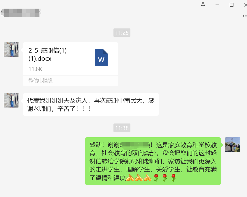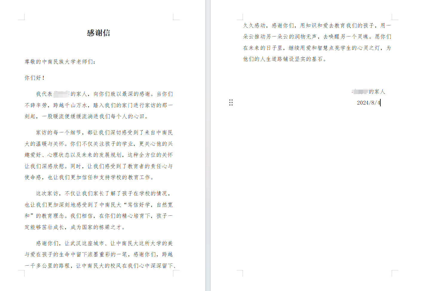 家訪結束后,學生家長特意寫了一封感謝信,他們在感謝信中深情感嘆:“家訪的每一個細節,都讓我們深切感受到了來自中南民大的溫暖與關懷。你們不僅關注孩子的學業,更關心他的興趣愛好、心理狀態以及未來的發展規劃,這種全方位的關懷讓我們深感欣慰。同時,讓我們感受到了教育者的責任心與使命感,也讓我們更加信任和支持學校的教育工作。”