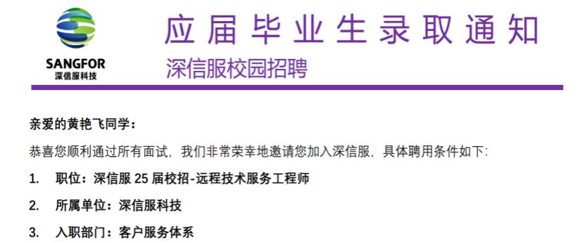 金秋十月,捷報頻傳。10月19日,黃艷飛同學歷經努力,成功斬獲深信服offer,這不僅是對其個人能力的高度認可,更是校企聯合培養計劃結出的又一碩果。