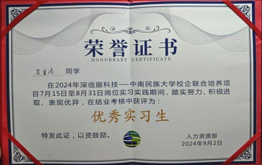 吳金波同學 榮獲深信服優秀實習生榮譽證書