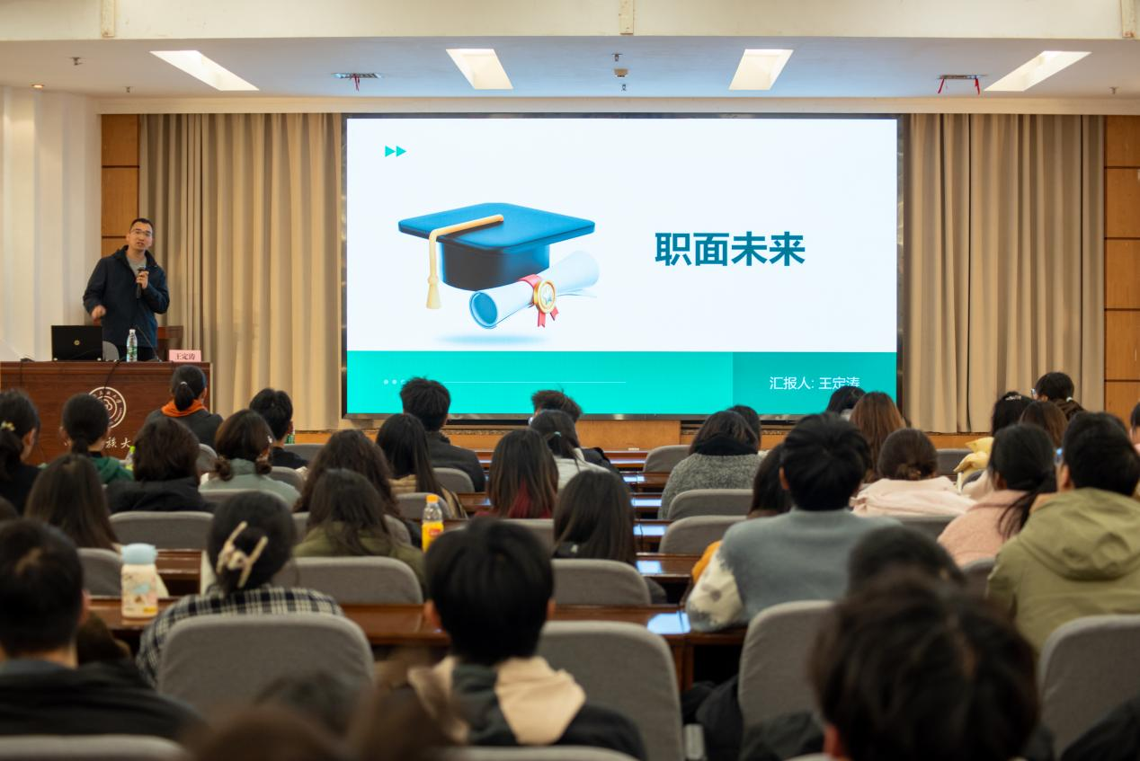 王定濤老師以職面未來(lái)為主題,從社會(huì)平均薪資調(diào)查、各行業(yè)頭部企業(yè)裁員情況以及畢業(yè)生規(guī)模與就業(yè)情況著重分析了當(dāng)前的就業(yè)形勢(shì),他指出當(dāng)前社會(huì)經(jīng)濟(jì)發(fā)展迅速,畢業(yè)賽道的選擇決定著人生的未來(lái)方向,面對(duì)日新月異的科技時(shí)代,要以規(guī)劃應(yīng)對(duì)變化,不要彷徨,不要沮喪,不要迷茫,不要慌張,保持熱愛(ài),充實(shí)自己,增強(qiáng)實(shí)力,不斷蓄力。