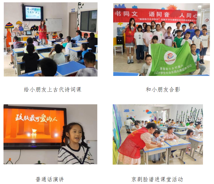 實踐活動期間,團隊成員在獨山縣百泉鎮翁奇村、中華社區、井橋社區3個站點共開設課程120余節,授課學生100余人。上課期間,團隊經過精心設計和安排,開設了普通話特色課程、普通話朗誦演講比賽、你畫我猜游戲以及京劇臉譜進課堂等一系列別開生面的推普活動,這些活動給當地學生們帶來了全新的體驗。在課堂上,通過與小朋友們積極互動,有效提升當地學生的普通話水平,促進語言文字交流,為鄉村振興貢獻青年力量。