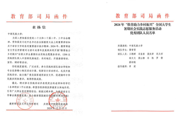 近日,由教育部語言文字應用管理司、共青團中央青年發展部聯合開展的2024年“推普助力鄉村振興”全國大學生暑期社會實踐志愿服務活動評選結果揭曉,我校組織赴貴州省獨山縣的“推普黔行先鋒隊”實踐團隊從全國1200支團隊中脫穎而出,獲評優秀團隊。教育部語言文字應用管理司和共青團中央青年發展部發來賀信,充分肯定我校在“推普助力鄉村振興”志愿服務活動中的突出表現和取得的積極成效。