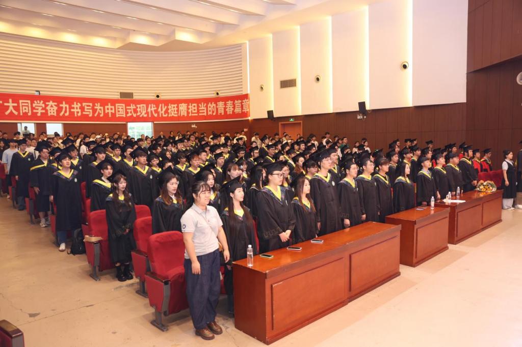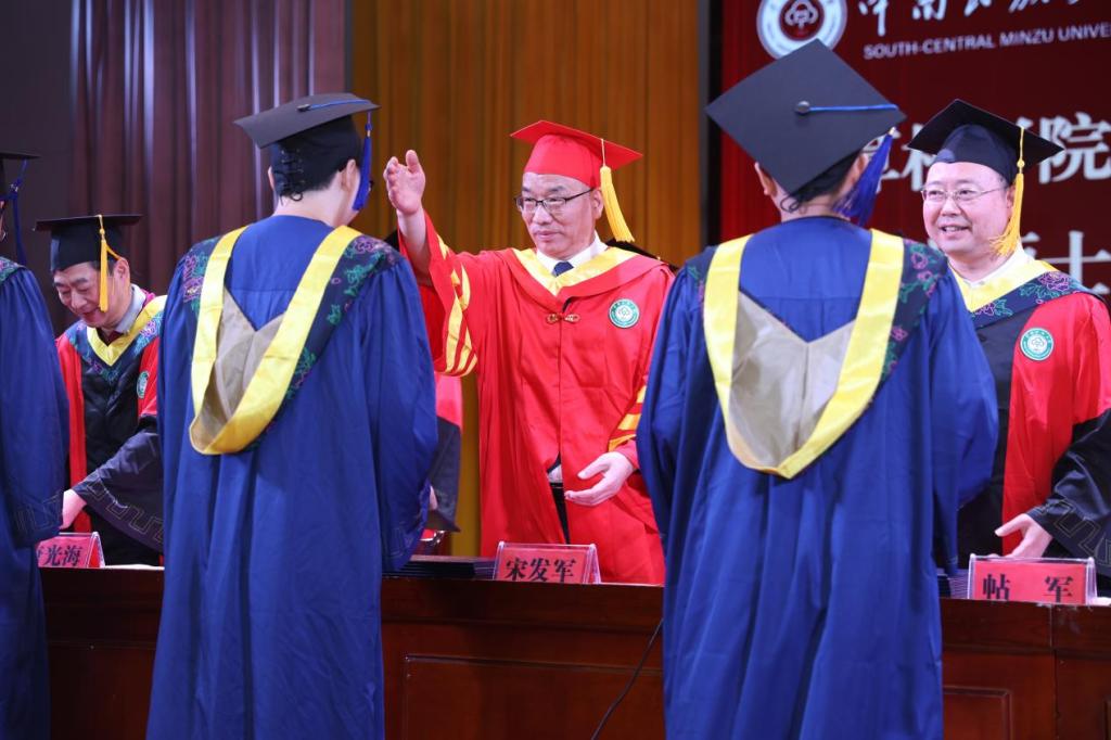 院長帖軍教授宣讀學位授予決定,標志著同學們正式完成了大學學業,即將告別校園,從知識儲備的“象牙塔”邁向強國實踐的“主戰場”。校黨委副書記、副校長宋發軍與學院領導班子行“撥穗禮”,為畢業生授予學位、撥正流蘇、頒發證書。老師們與畢業生握手話別,送上祝福。