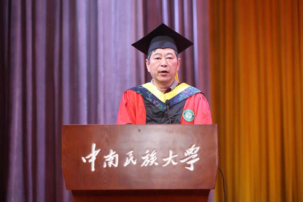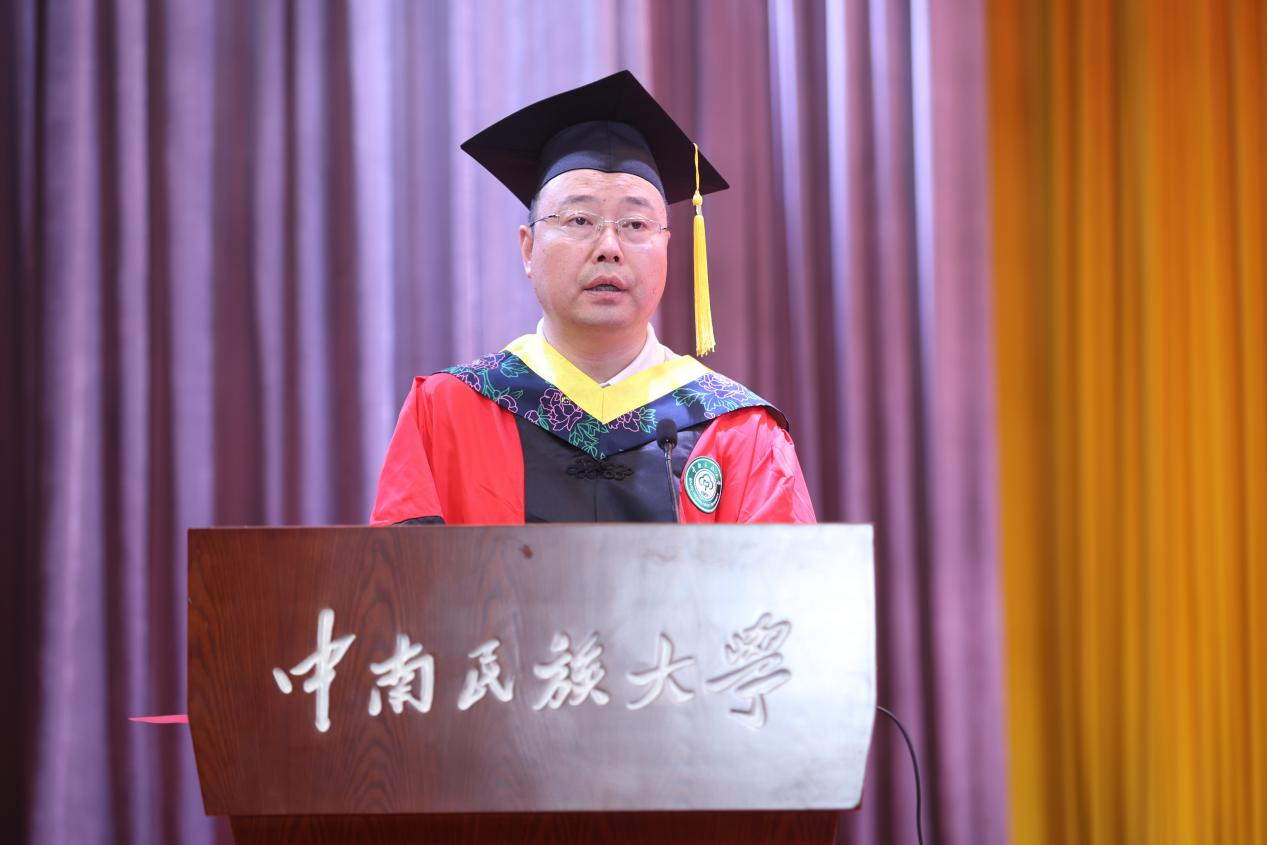 院長帖軍代表學院致辭,他代表學院全體師生,向圓滿完成學業的同學們表示最熱烈的祝賀,提出三點希望: 第一,要做“科技自立自強”的踐行者;第二,要做“數字中國建設”的弄潮兒;第三,要做“有溫度的科技工作者”,并寄語廣大畢業生,永遠保持對計算機科學的熱愛,保持“終身學習”的能力。特別是作為民大學子,要時刻牢記“篤信好學、自然寬和”的校訓精神,用數字技術促進各民族交往交流交融。
