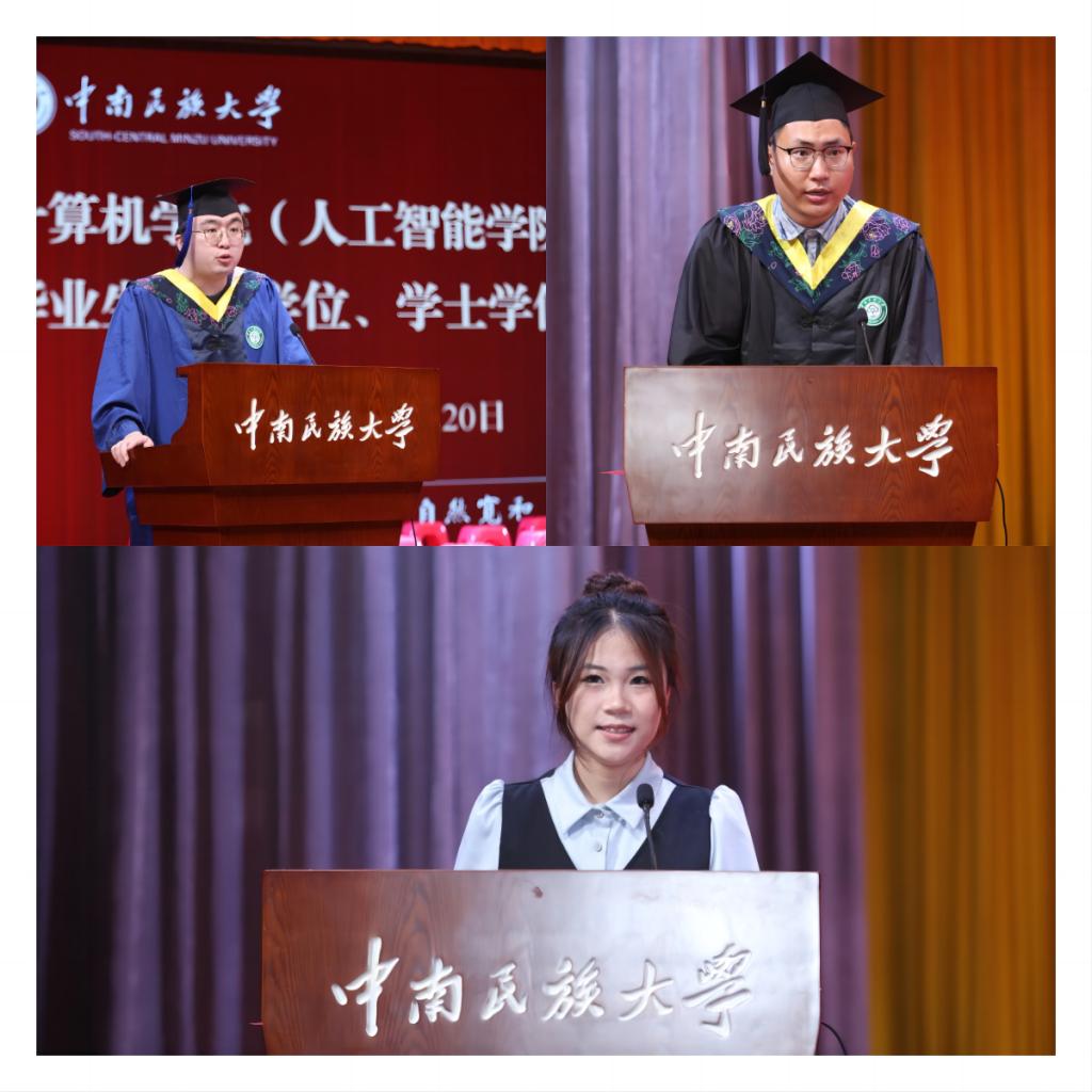碩士畢業生代表2022級劉洲同學深情回顧了自己的研究生生涯,感謝恩師的悉心指導與培養,勉勵所有同窗帶著民大的基因走向五湖四海,用數據算法為鄉村振興注入新動能。本科畢業生代表2021級陳科偉同學分享了大學四年求索成長的真實心路歷程,感謝老師們為學生著想的心、徹夜的陪伴、操場上暢談的勉勵,感謝母校的培養。在校生代表2024級鄭陸奕丹同學感謝學長學姐們在學習生活、科研競賽、社團活動等方面的悉心幫扶,祝愿他們奔赴人生新的征途,開啟精彩新篇章。