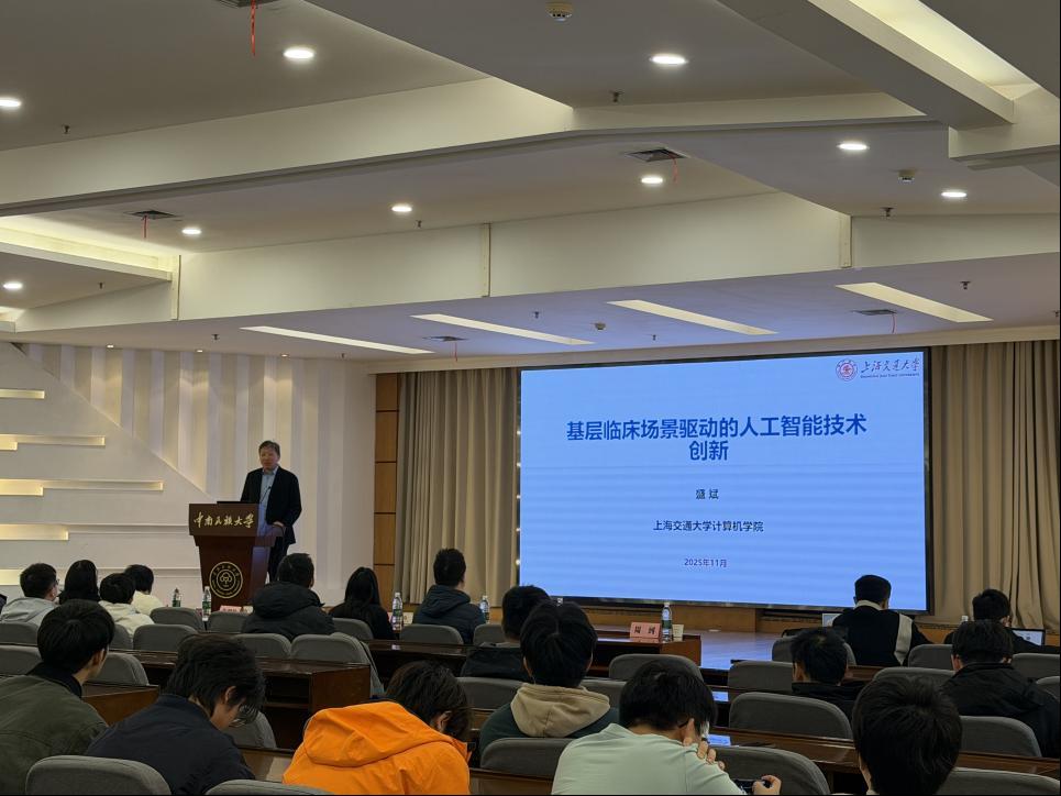 2025年11 月 20 日,中南民族大學(xué)計(jì)算機(jī)學(xué)院(人工智能學(xué)院)主辦的學(xué)術(shù)講座《基層醫(yī)療需求驅(qū)動(dòng)的人工智能技術(shù)創(chuàng)新》在學(xué)術(shù)交流中心二樓潤(rùn)良報(bào)告廳舉行。上海交通大學(xué)計(jì)算機(jī)學(xué)院人工智能教育部重點(diǎn)實(shí)驗(yàn)室教授、博士生導(dǎo)師盛斌應(yīng)邀主講,計(jì)算機(jī)學(xué)院(人工智能學(xué)院)黨委書記潘宏飛,黨委副書記、院長(zhǎng)帖軍,副院長(zhǎng)張瀟,網(wǎng)絡(luò)空間安全系黨支部書記朱劍林、系主任王俊,人工智能系主任康怡琳,生物醫(yī)學(xué)工程學(xué)院周到、深圳大學(xué)溫陽(yáng)、華中科技大學(xué)同濟(jì)張宇聰、武漢工程大學(xué)陳燈、武漢紡織大學(xué)黃晉等嘉賓出席,會(huì)議由張瀟主持,參會(huì)師生共同探討人工智能與醫(yī)學(xué)交叉領(lǐng)域的前沿發(fā)展。