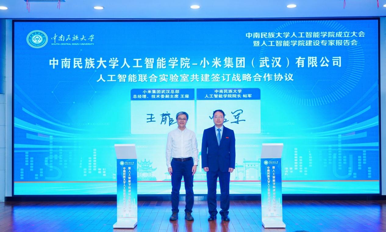 大會現場還舉辦了中南民族大學人工智能學院與小米科技武漢有限公司共建人工智能聯合實驗室簽約儀式,雙方表示,將在人才培養、科技賦能、科技創新等方面進一步加強交流合作。