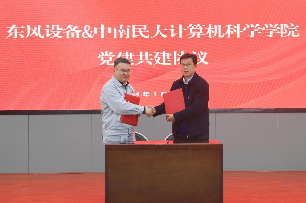中南民族大學計算機科學學院一行受邀參加東風設備制造有限公司“匠心領勢”黨建品牌2.0發布大會,會上,學院黨委書記柯尊韜與東風設備制造有限公司黨委書記劉湘慶簽訂黨建共建合作協議。雙方協商共同定期開展黨建活動、共建產學研用合作基地、共建畢業生就業基地、共建實習實踐基地、共同開展文化與創新創業活動合作、共同研究相關課題。