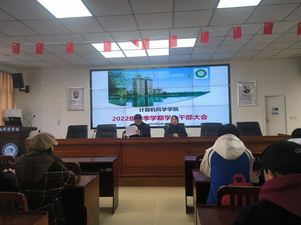 2024年2月27日,計算機科學學院2022級學生干部大會順利召開。本次大會公布了專業分流后學生干部換屆方案以及新學期的學生干部工作規劃。本次參會人員有2022級輔導員劉浩然老師、祝夢歡老師以及2022級學生干部。會議由祝夢歡老師主持。