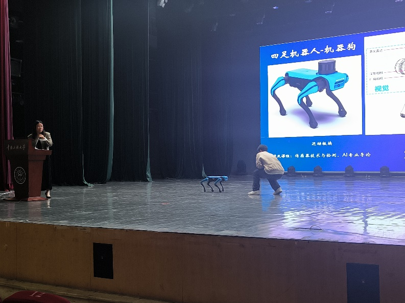 首先由康怡琳老師為大家介紹人工智能專業(yè),通過圖像和視頻向學生們展示了人工智能在生活中廣泛的應用場景,同時介紹了來自智能車實驗室的自動駕駛小車,機器狗、分揀機械臂等智能設備,另外還特別邀請學長學姐們現場展示機器狗,分享在人工智能專業(yè)的學習體會。學生在學習過程中活學活用,將所學知識轉化成實際成果。