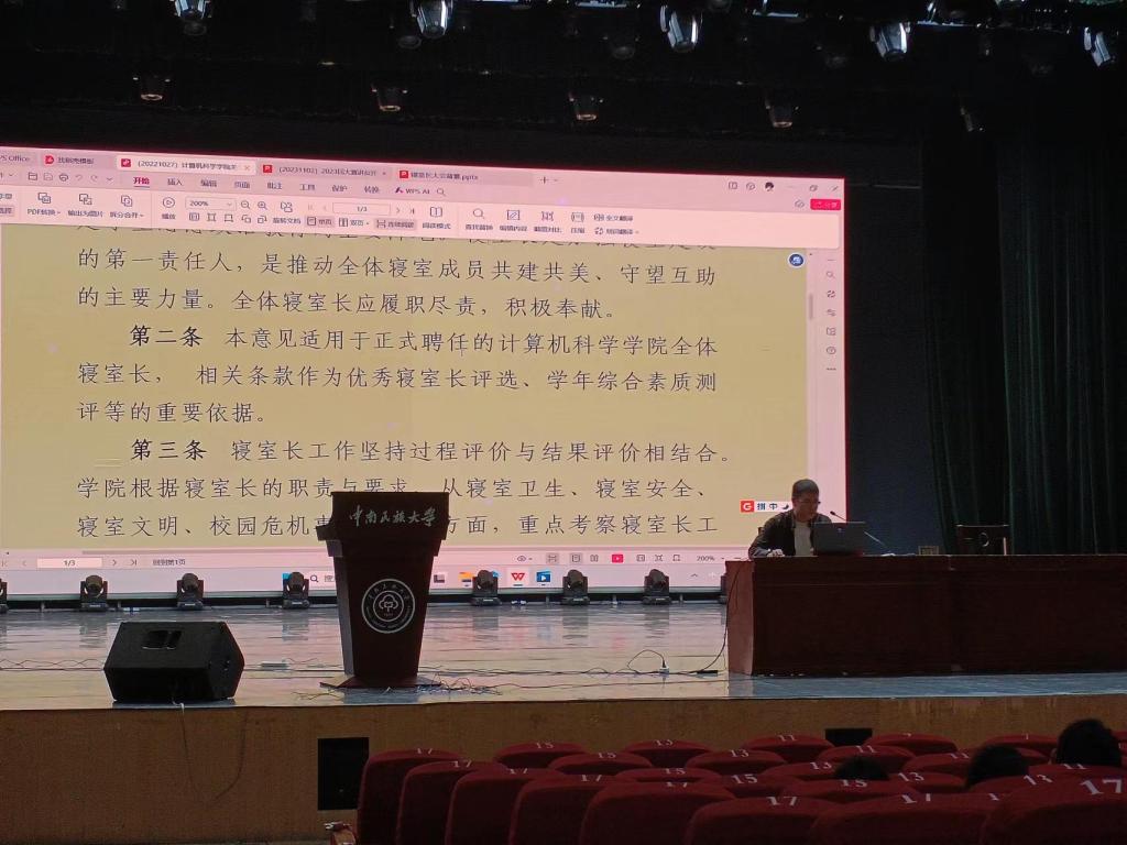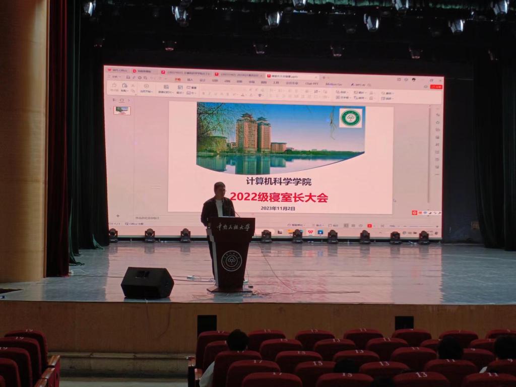 為加強寢室建設、提高寢室長能力素養,增強寢室長的責任意識,2023年11月2日下午計算機科學學院2022級本科生寢室長大會在學校大禮堂召開。2022級輔導員劉浩然老師、祝夢歡老師組織了本次會議,2022級本科生全體寢室長參加了會議。