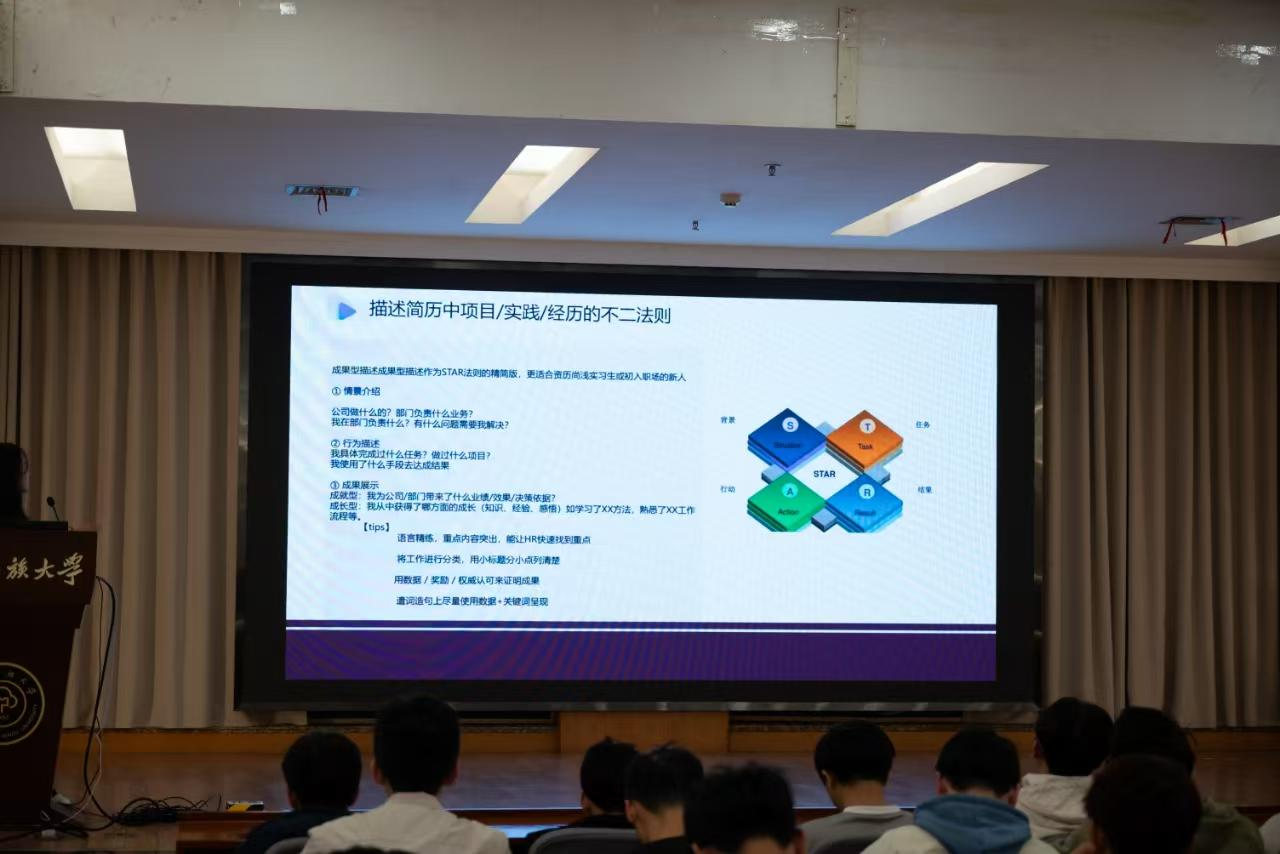 談及簡歷撰寫,楊曉涵女士更是傾囊相授。她詳細介紹了企業(yè)篩選簡歷的流程,強調(diào)了關(guān)鍵詞在簡歷中的重要性,并建議同學(xué)們以企業(yè)需求為導(dǎo)向,精準(zhǔn)匹配個人經(jīng)歷與崗位要求。她推薦采用“STAR法則”構(gòu)建簡歷,通過清晰的結(jié)構(gòu)、量化的成果和具體的行動來展示個人優(yōu)勢,使簡歷更具競爭力。在面試技巧方面,楊曉涵女士從面試官的角度出發(fā),詳細闡述了面試前的準(zhǔn)備工作,包括著裝、舉止等細節(jié)。她指出,面試不僅是對專業(yè)知識的考察,更是對綜合素質(zhì)的檢驗。她介紹了“STAR”結(jié)構(gòu)在面試中的應(yīng)用,強調(diào)真實性、完整性和具體性,幫助同學(xué)們更好地展現(xiàn)個人魅力。此外,她還分享了群體面試的技巧及面試官關(guān)注的重點,為同學(xué)們提供了寶貴的面試實戰(zhàn)指南。