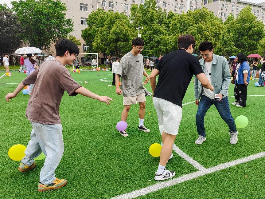 壓軸登場的“踩氣球”游戲,將全場氣氛推向最高潮。綁在參與者腳踝上的氣球,宛如等待綻放的“青春花火”。隨著一聲令下,大家如離弦之箭般沖入“戰場”,眼神中滿是斗志與自信。氣球的爆裂聲“砰砰”作響,與此起彼伏的加油助威聲交織在一起,譜寫出激昂的青春樂章。2023級兩位輔導員老師也投入其中,現場氣氛十分熱烈。