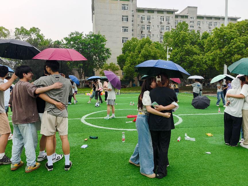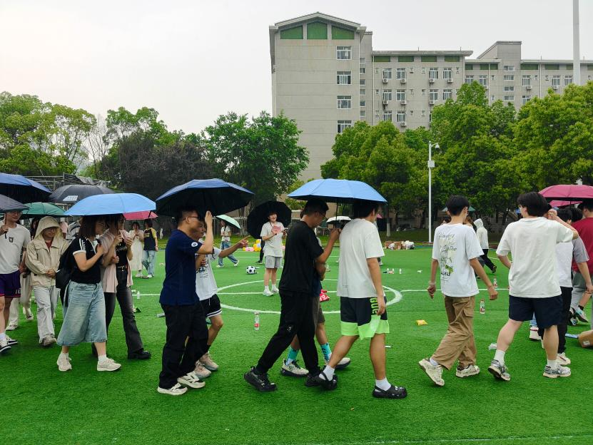 趣味運動會開場時,天空突然下起朦朧細雨,但雨水并沒有澆滅同學們參與本次活動的澎湃熱情。在進行“時間炸彈”游戲的現場,隨著節目主持人手中的鬧鐘開始計時,空氣里瞬間彌漫起緊張又興奮的氣息,倒計時聲如同擂響的戰鼓,敲擊著每個人的心弦。