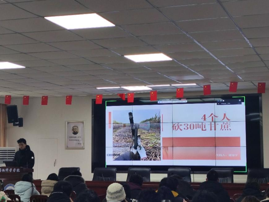 黨支部成員代表何嘉豪、周游、謝沛宇、鄭竣方、徐夢(mèng)茹、李詩琦6位同學(xué)依次走上講臺(tái),圍繞寒假社會(huì)實(shí)踐、寒假見聞等內(nèi)容開展個(gè)人分享,有的同學(xué)結(jié)合個(gè)人經(jīng)歷,傾囊相授參與社會(huì)實(shí)踐的方法和經(jīng)驗(yàn);有的同學(xué)踏上紅色之旅,深入革命圣地,繪聲繪色地講述著一段段令人動(dòng)容的紅色故事,將大家?guī)Щ氐侥嵌尾憠验煹膷槑V歲月,使革命精神在現(xiàn)場(chǎng)傳遞、激蕩;其中,謝沛宇同學(xué)分享了“1天,4個(gè)人,砍30噸甘蔗”的生動(dòng)故事。
